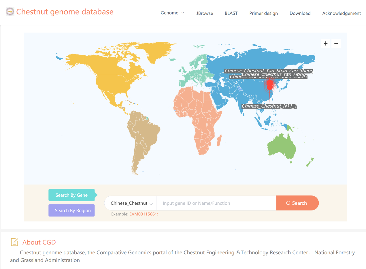 此外,依托國家林草局板栗工程中心,構(gòu)建了板栗基因組數(shù)據(jù)庫(圖三),為瀏覽基因組(JBrowse)、搜索序列(BLAST)和設(shè)計(jì)引物提供了工具。