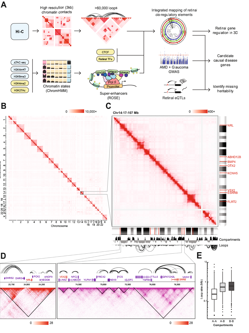 在過(guò)去視網(wǎng)膜疾病的全基因組關(guān)聯(lián)研究(GWAS)發(fā)現(xiàn)常見(jiàn)的變異主要在基因組非編碼區(qū)域,但由于先導(dǎo)變異區(qū)域的局部連鎖不平衡(LD),阻礙了特定關(guān)聯(lián)基因和變異的識(shí)別,因此闡明與性狀相關(guān)的遺傳變異如何影響調(diào)節(jié)基因表達(dá)網(wǎng)絡(luò),并因此影響表型,亟需了解相關(guān)組織和細(xì)胞類型的3D基因組拓?fù)浣Y(jié)構(gòu)。