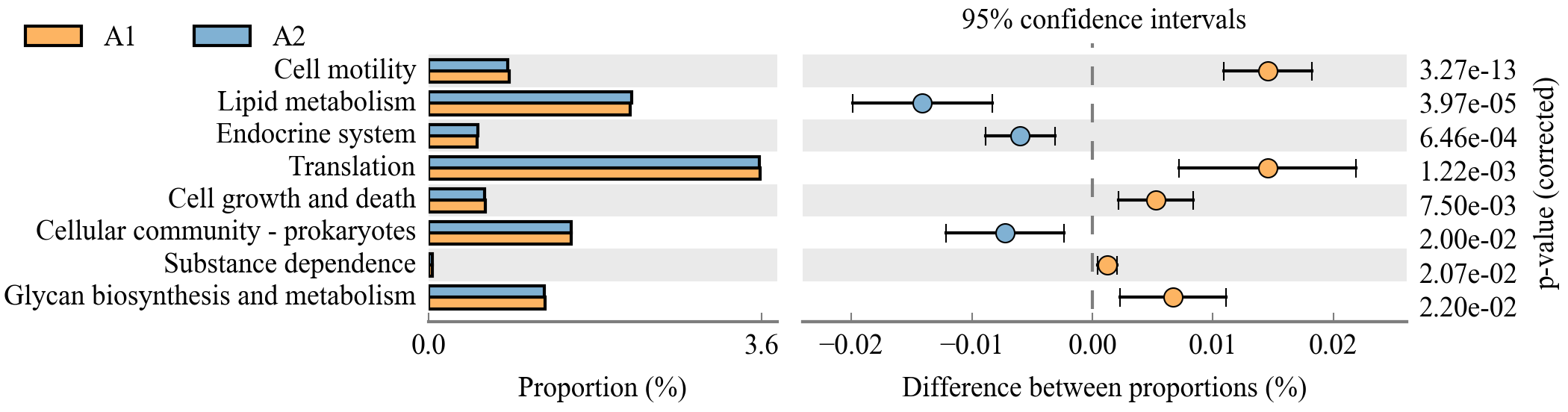 PICRUSt 2 將特征序列(16S rRNA)與微生物基因組數(shù)據(jù)庫(kù)(IMG,Integrated Microbial Genomes)參考序列對(duì)齊(aliign)構(gòu)建進(jìn)化樹(shù),找到特征序列的“最近物種”,并根據(jù)已知物種的基因種類(lèi)和豐度信息預(yù)測(cè)未知物種的基因信息,從而結(jié)合基因的KEGG通路信息預(yù)測(cè)整個(gè)群落的通路情況。通過(guò)組間差異分析,得到在組間具有顯著差異的功能,最后利用Stamp對(duì)結(jié)果進(jìn)行差異可視化。