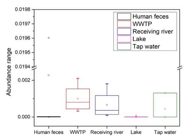 借助人類糞便指示劑 crAssphage (CPQ_056),分析了人類糞便排放對當(dāng)?shù)厮h(huán)境中ARGs的影響。結(jié)果表明,crAssphage在所有環(huán)境樣品中的檢測頻率為 68.2%,相對豐度范圍為2.68×10-6至1.96×10-2每個16S rRNA基因拷貝(圖2),表明超過一半的水樣(湖水、自來水、污水處理廠和受納河水)被人類糞便污染。與 ARGs 一致,平均crAssphage 豐度也沿著水流從污水處理廠不同處理單元的污水到受納河水再到湖泊水體的順序逐漸減少(圖2)。這再次證明了人類糞便污染從污水處理廠的排放源到接收環(huán)境有著隨距離不斷衰減的效應(yīng)。