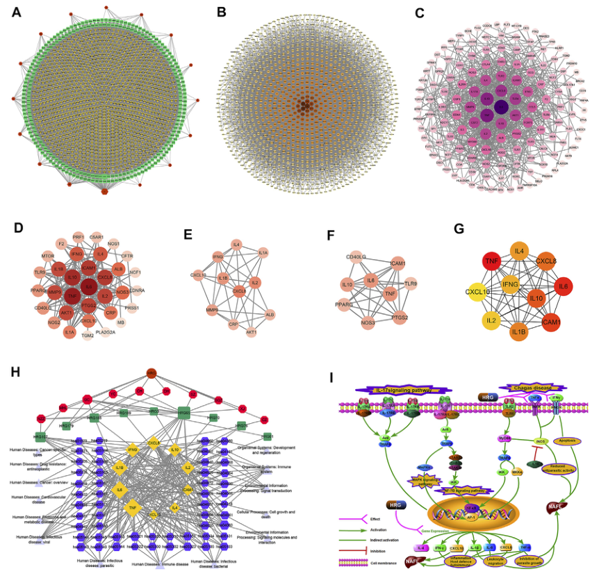 (A)HRG藥材靶點網(wǎng)絡(luò)。(B)與NAFL有關(guān)的PPI網(wǎng)絡(luò)。(C)與IFD有關(guān)的PPI網(wǎng)絡(luò)。(D)HRG-IFD-NAFL合并目標(biāo)的PPI網(wǎng)絡(luò)。(E)模塊1(F)模塊2(G)Hub基因。(H)草藥-關(guān)鍵化合物-潛在靶向途徑網(wǎng)絡(luò)。(I)關(guān)鍵靶點可能導(dǎo)致的關(guān)鍵生物進(jìn)展圖例。