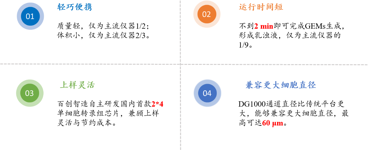 百創(chuàng)DG1000突破直徑壁壘:為了突破單細(xì)胞試劑耗材及儀器長期以來的國外技術(shù)壟斷,降低單細(xì)胞應(yīng)用的成本,突破主流平臺(tái)40μm細(xì)胞直徑限制,滿足更多的單細(xì)胞場景需求。經(jīng)過潛心研發(fā),百邁客發(fā)布了自主研發(fā)的單細(xì)胞微液滴系統(tǒng)-百創(chuàng)DG1000。