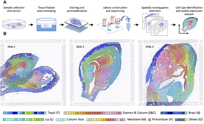 研究內(nèi)容:利用10x Visium空間轉(zhuǎn)錄組學(xué)數(shù)據(jù)分析了蝴蝶蘭花器官早期發(fā)育過程中基因表達(dá)的動(dòng)態(tài)變化。通過對(duì)時(shí)空表達(dá)分布的比較,確定了在特定組織/階段優(yōu)先表達(dá)的數(shù)千個(gè)基因,包括MADS-box基因和許多其他潛在下游基因,形成了花器官初始化、身份決定和形態(tài)建成的模型。對(duì)蘭花開花發(fā)育過程進(jìn)行了系統(tǒng)的研究,為進(jìn)一步研究蘭花開花過程中復(fù)雜而重要的基因調(diào)控網(wǎng)絡(luò)提供了寶貴的資源。