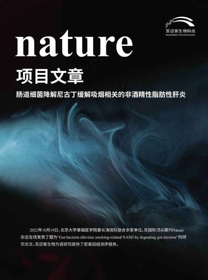 2022年10月19日,北京大學(xué)醫(yī)學(xué)部姜長濤團隊聯(lián)合美國國立衛(wèi)生研究院、浙江大學(xué)醫(yī)學(xué)院、復(fù)旦大學(xué)基礎(chǔ)醫(yī)學(xué)院和溫州醫(yī)科大學(xué)的研究團隊在國際期刊《Nature》發(fā)表了題為“Gut bacteria alleviate smoking-related NASH by degrading gut nicotine”的重磅研究。該研究解析了腸道尼古丁積累在非酒精性脂肪性肝炎進展中的作用,發(fā)現(xiàn)了人類腸道中一種能夠代謝尼古丁的內(nèi)源性細菌,并提出了一種可能的減少吸煙加劇NAFLD進展的途徑。百邁客為該研究提供了宏基因組測序服務(wù)。點擊了解詳情:Nature-宏基因組聯(lián)合多組學(xué)研究揭示腸道有益菌對非酒精性脂肪性肝炎的保護作用