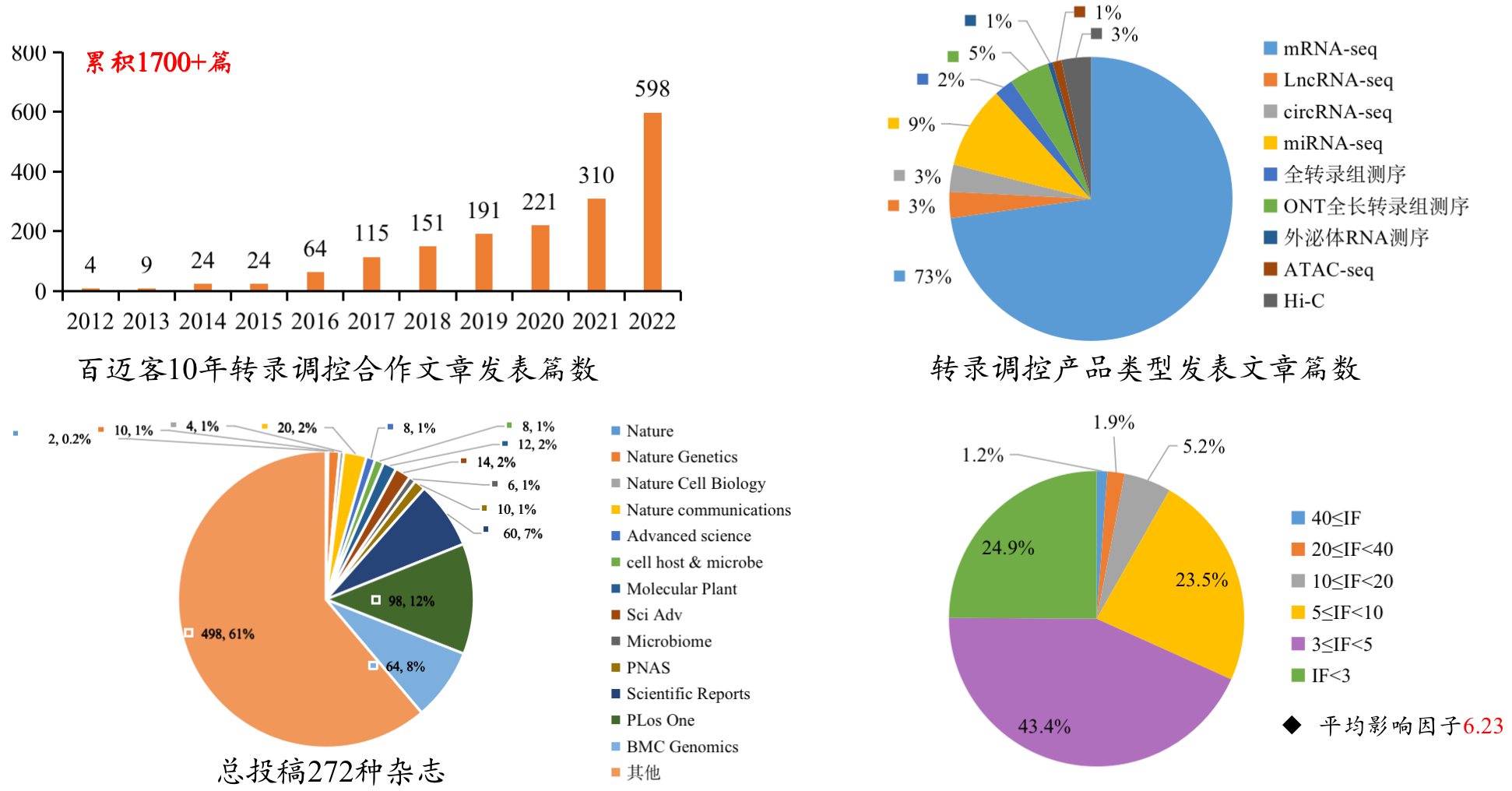百邁客轉(zhuǎn)錄調(diào)控合作項目文章持續(xù)爆發(fā)增長,累積1700篇,2022年度收錄598篇,總IF高達3500+,平均影響因子6.23。