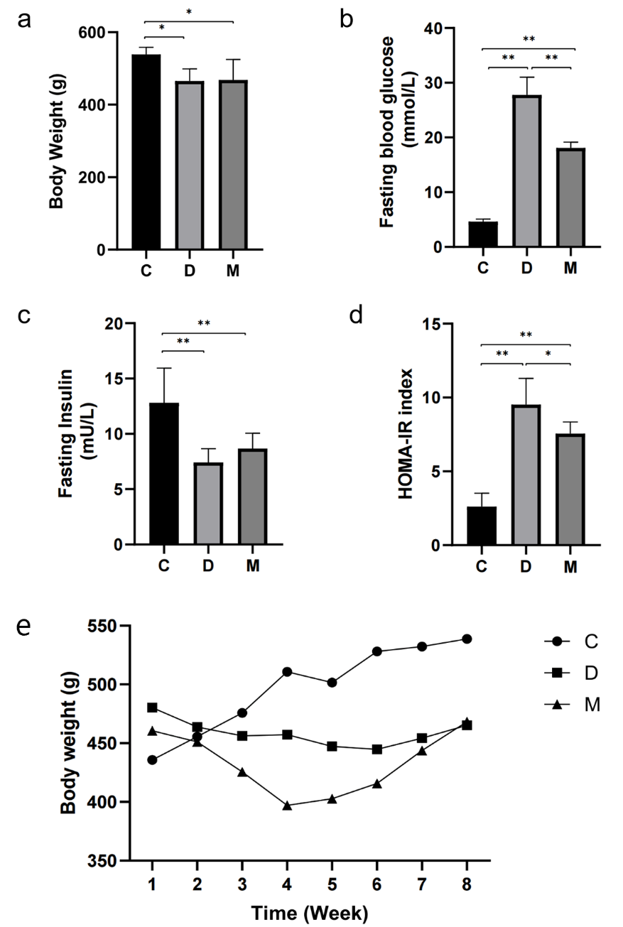 MOTS-c治療8周后,D組和M組大鼠體重低于C組(圖1a和圖1e)。與D組相比,M組大鼠空腹血糖水平降低(圖1b)。此外,與C組相比,D組和M組大鼠胰島素水平下降,D組和M組間胰島素水平無顯著差異(圖1c)。通過計(jì)算HOMA-IR指數(shù)評估胰島素抵抗。與C組相比,D組大鼠的HOMA-IR指數(shù)顯著升高,而M組大鼠HOMA-IR指數(shù)較D組降低。