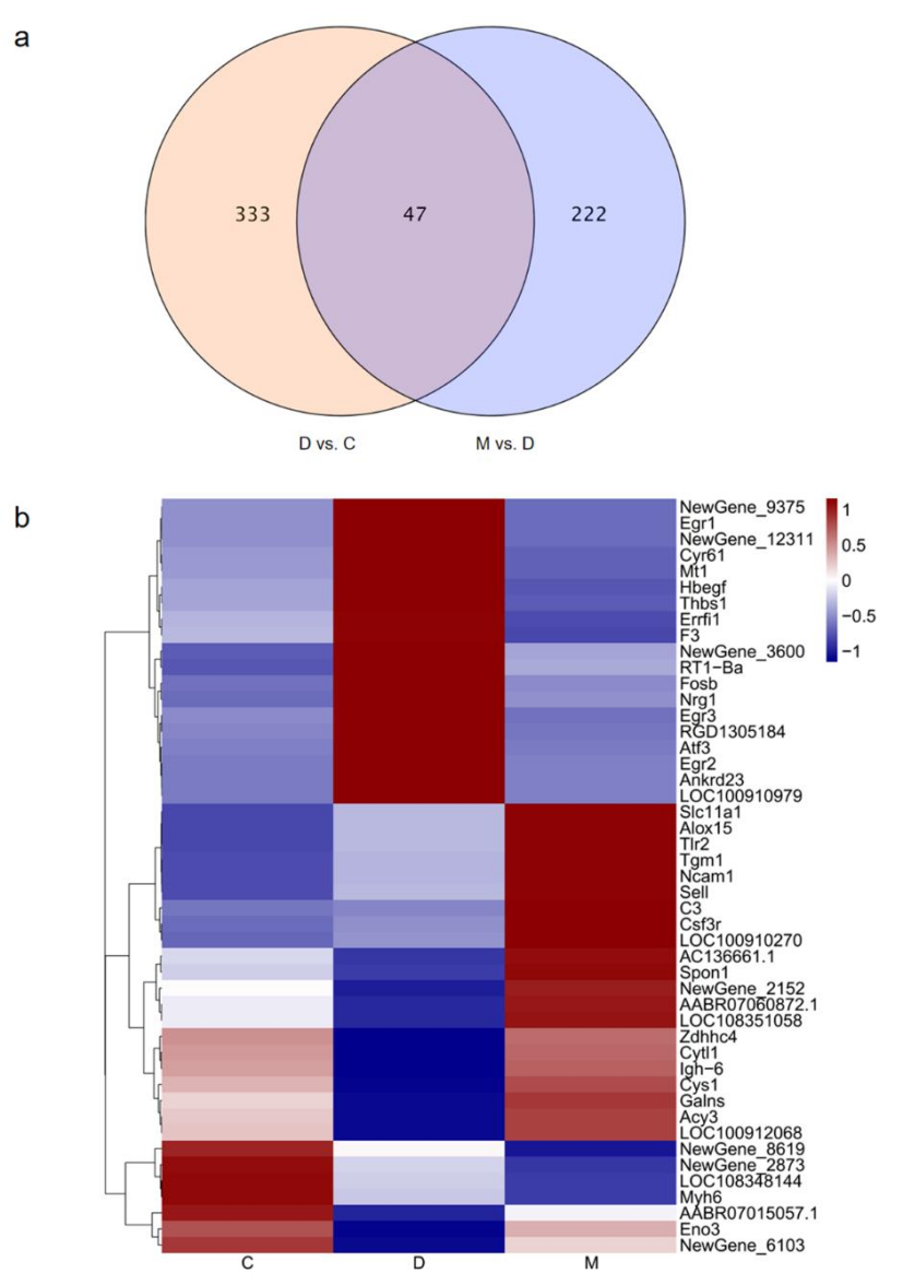 為了進(jìn)一步探究糖尿病大鼠對MOTS-c的適應(yīng)性反應(yīng)的機(jī)制,研究者利用RNA-Seq技術(shù),測定了心肌組織基因全長轉(zhuǎn)錄表達(dá)。以C組為對照,D組表現(xiàn)出的差異表達(dá)基因(DEGs)即致病基因,再以D組為對照組篩選出M組的差異表達(dá)基因,二者篩選出的DEGs中重疊的基因即為MOTS-c改變的致病基因。將以上步驟執(zhí)行,篩選出47個(gè)MOTS-c改變的致病基因(圖4a)。將這47個(gè)基因進(jìn)行熱圖分析后發(fā)現(xiàn),C組基因表達(dá)趨勢與D組相反,而與M組近似(圖4b)。