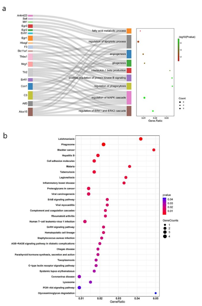 采用Gene Ontology(GO)與Kyoto Encyclopedia of Genes and Genomes(KEGG)對MOTS-c所改變的47個(gè)致病基因進(jìn)行功能富集分析。GO 注釋系統(tǒng)包含三個(gè)主要分支,即:生物學(xué)過程(BP)、分子功能(MF)和細(xì)胞組分(CC)。)8 周 MOTS-c 注射所改變的 47 個(gè)糖尿病致病基因共富集于 195 個(gè) GO term 中,其中 188 個(gè) term 富集于 BP,2 個(gè) term 富集于 CC,5 個(gè) term 富集于MF。經(jīng)過 ClueGO 聚類分析后,195 個(gè) term 主要富集于 9 個(gè)類別(見圖 5b),分別為血管生成(angiogenesis)、凋亡過程調(diào)控(regulation of the apoptotic process)、MAPK 級聯(lián)調(diào)控(regulation of MAPK cascade)、蛋白激酶活性正調(diào)控(positive regulation of protein kinase activity)、脂肪酸代謝過程(fatty acid metabolic process)、吞噬作用調(diào)節(jié)(regulation of phagocytosis)、蛋白激酶 B 信號(hào)正調(diào)控(positive regulation of protein kinase B signaling)、ERK1/2 級聯(lián)(regulation of ERK1/2 cascade)、膠質(zhì)生成(gliogenesis)和白細(xì)胞介素-1 的產(chǎn)生(interleukin-1 beta production)。KEGG通路富集分析顯示,18條KEGG通路顯著富集(圖5b),其中5條信號(hào)通路與免疫、凋亡和糖代謝相關(guān)(ErbB信號(hào)通路、補(bǔ)體和凝血級聯(lián)、c型凝集素受體信號(hào)通路、PI3K-Akt信號(hào)通路和AGE-RAGE信號(hào)通路)。在功能富集通路注釋基因中,ALOX15、ATF3、CCN1、EGR1、EGR3、ERRFI1、THBS1、TLR2和NRG1高頻率注釋。CCN1與EGR1基因高表達(dá),同時(shí)均注釋在凋亡相關(guān)的GO term中,而CCN1也注釋于富集顯著性最高的ERK1/2級聯(lián)通路中,表明CCN1、ERK1/2與EGR1可能是相互關(guān)聯(lián)的關(guān)鍵基因。