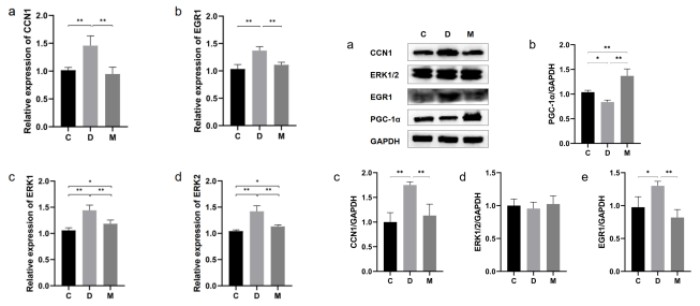 為了驗(yàn)證CCN1、ERK1/2與EGR1是否在MOTS-c改善糖尿病心臟結(jié)構(gòu)與功能中發(fā)揮重要作用,也為了進(jìn)一步探究MOTS-c對線粒體發(fā)生的作用,研究者利用RT-PCR與Western Blotting技術(shù)測定了CCN1、ERK1/2、EGR1的基因表達(dá)與蛋白表達(dá)以及線粒體發(fā)生標(biāo)志蛋白PGC-1α的蛋白表達(dá)。結(jié)果表明,MOTS-c治療后,糖尿病大鼠心肌中PGC-1α蛋白表達(dá)顯著上升(圖7a);CCN1、ERK1/2和EGR1基因表達(dá)顯著降低(圖6);CCN1、EGR1蛋白表達(dá)顯著降低,ERK1/2的總蛋白表達(dá)量不變(圖7),但多個(gè)研究表明MOTS-c僅影響ERK1/2的磷酸化水平。