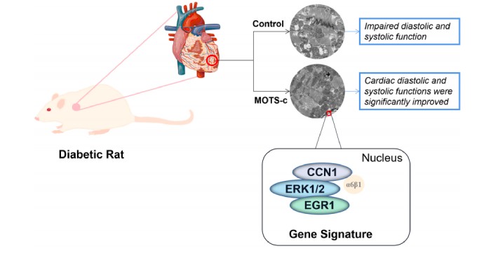為期8周的MOTS-c治療減少了糖尿病患者的心功能障礙與線粒體損傷,MOTS-c可能是通過調(diào)節(jié)脂肪酸代謝、免疫調(diào)節(jié)、血管生成和細(xì)胞凋亡產(chǎn)生作用。CCN1/ERK1/2/EGR1的信號(hào)轉(zhuǎn)導(dǎo)可能在MOTS-c抑制心肌細(xì)胞凋亡中發(fā)揮重要作用。
