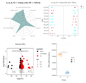 2、Z-score分析:Z-score是基于代謝物的定量值轉(zhuǎn)換而來(lái)的值,用于衡量實(shí)驗(yàn)組相對(duì)于對(duì)照組的差異偏離情況。通過(guò)Z-score圖可展示不同兩組間差異代謝物的偏離情況。