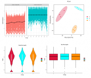 3、箱線圖和小提琴圖可以反映數(shù)據(jù)的分布情況和變異程度,小提琴圖結(jié)合了箱式圖和密度圖的特征,主要用來(lái)顯示數(shù)據(jù)的分布性狀。箱線圖和小提琴圖可直觀展示組間顯著差異的代謝物。