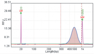 純化后的PCR產(chǎn)物,需要進一步濃度和片段大小檢測。其中濃度能達到上機測序要求即可;片段大小必須滿足:片段范圍為300-700bp,主峰在450-550bp;無接頭片段和大片段污染。質(zhì)檢合格的產(chǎn)物可用于高通量測序。