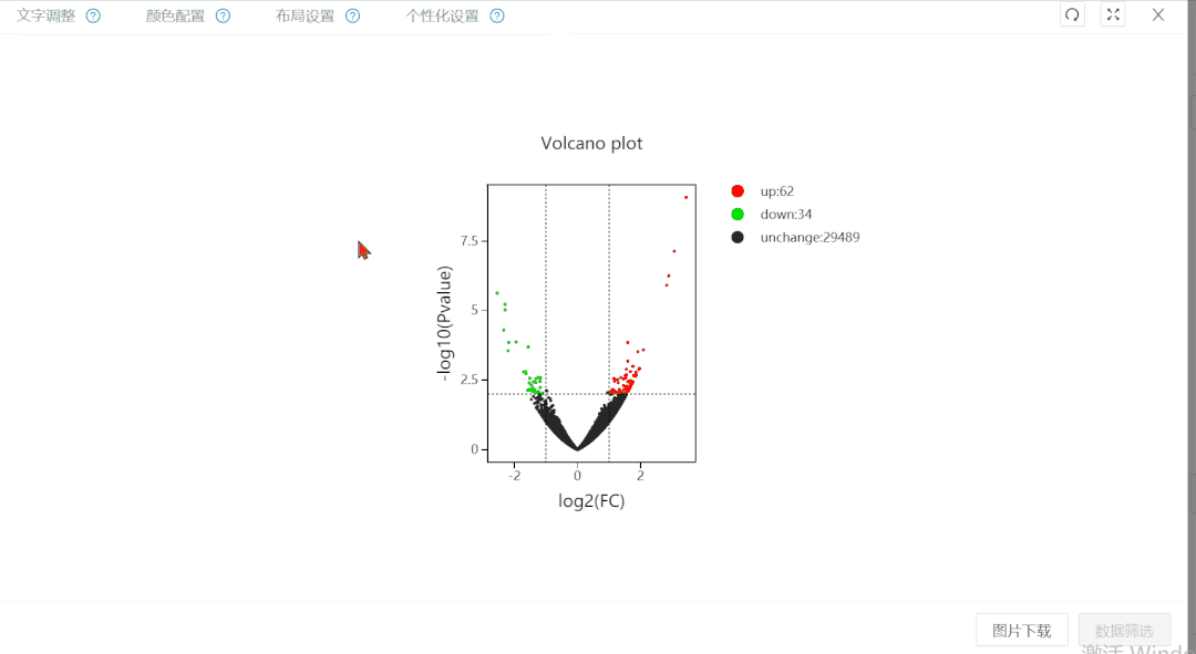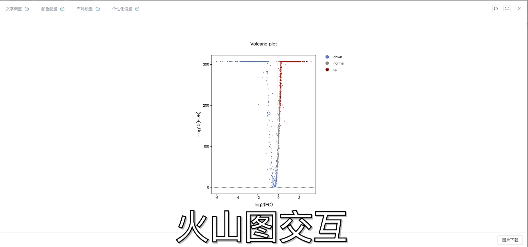 火山圖(Volcano Plot)可以快速地查看基因/物質(zhì)在兩個(gè)(組)樣品中表達(dá)水平的差異?;鹕綀D的交互式支持自定義展示一定數(shù)目的重點(diǎn)差異基因,還支持支持選擇重點(diǎn)差異基因進(jìn)行數(shù)據(jù)篩選,進(jìn)行二次數(shù)據(jù)處理。