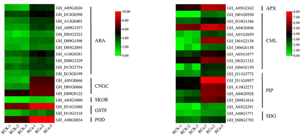 圖4高抗性棉花R對(duì)正常/異常濃度Ca2+脅迫的反應(yīng)(備注:CaM:鈣調(diào)蛋白;CML:鈣調(diào)素樣蛋白;CDPK:鈣依賴性蛋白激酶;ABRE:ABA反應(yīng)元件;MYBWRKYbHLH:轉(zhuǎn)錄因子;ABA:脫落酸;SA:水楊酸;SKOR:K通道;PIP:質(zhì)膜內(nèi)蛋白;TIP:液泡膜固有蛋白;PLR2:松脂醇-落葉松醇還原酶2編碼基因)