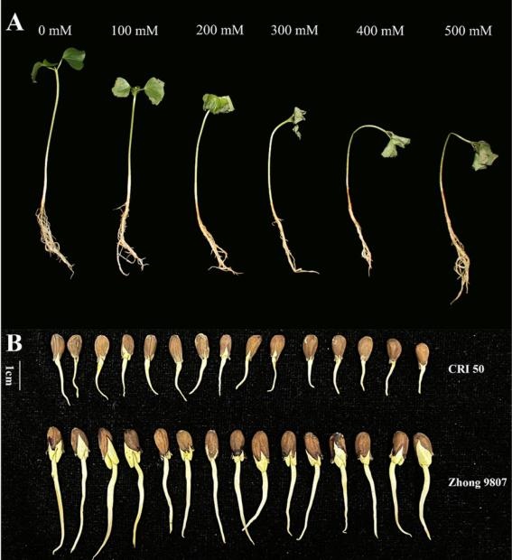 在本研究中,四個(gè)棉花品種的103份棉花材料在萌發(fā)期間受到200mMCaCl2脅迫。根據(jù)發(fā)芽情況,分別選擇了1份耐CaCl2脅迫的棉花品種(zhong9807,R)和1份對(duì)CaCl2脅迫敏感的品種(CRI50,S)。