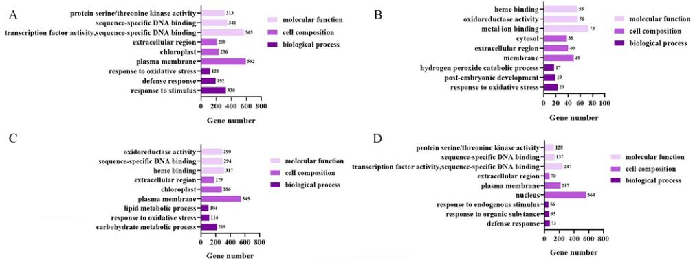 本研究對(duì)103份棉花材料在200mMCaCl2脅迫下萌發(fā),從103份棉花材料中篩選出一個(gè)極端抗Ca2+基因型(中9807,R)和一個(gè)Ca2+敏感基因型(CRI50,S)。然后將這兩份材料分別在0mMCaCl2和200mMCaCl2中發(fā)芽5天,然后取樣進(jìn)行轉(zhuǎn)錄組測(cè)序。形態(tài)學(xué)和生理學(xué)分析表明,在R中特異表達(dá)的PLR2可能通過促進(jìn)SDG的合成來增強(qiáng)棉花清除活性氧的能力。綜上所述,本研究提出了棉花應(yīng)對(duì)高鈣脅迫的適應(yīng)機(jī)制,有助于提高棉花的抗逆性。