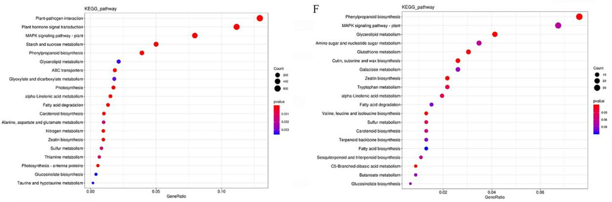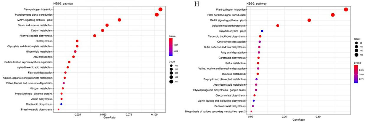 圖2:A-D:RvsS的DEGs在生物過程、細(xì)胞成分和分子功能中的GO富集圖;E-H:R與S的DEGsKEGG富集點(diǎn)圖(注:A:RCKvsRCa;B:RCavsSCa;C:SCKvsSCa;D:RCKvsRCavsSCKvsSCa中R特異性表達(dá)的DEGs;E:RCKvsRCa;F:RCavsSCa;G:SCKvsSCa;H:R-RCKvsRCavsSCKvsSCa中特異表達(dá)的DEG。)