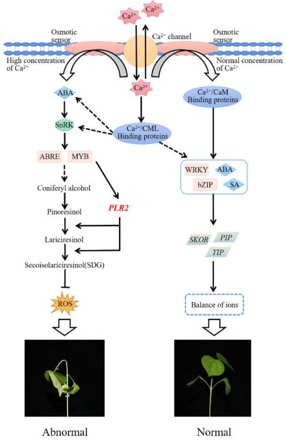 當(dāng)Ca2+從細(xì)胞外或液泡涌入細(xì)胞質(zhì)時(shí),細(xì)胞質(zhì)中的Ca2+濃度會(huì)增加,Ca2+會(huì)與一些Ca2+受體蛋白CaM和CML結(jié)合,形成Ca2+/CaM(CML)結(jié)合蛋白。激活的Ca2+信號(hào)導(dǎo)致一些下游轉(zhuǎn)錄因子的表達(dá)增加,如WRKY和bZIP,通過調(diào)節(jié)細(xì)胞內(nèi)外水和離子的平衡,細(xì)胞在傳遞Ca2+信號(hào)后可以迅速恢復(fù)到低濃度Ca2+環(huán)境的狀態(tài)。同時(shí),一些激素也受Ca2+信號(hào)的調(diào)節(jié),如ABA和SA,可以緩解棉花中的Ca2+瞬變。當(dāng)植物暴露于高濃度的Ca2+時(shí),它們?cè)僖膊荒艿挚箚为?dú)由通道蛋白引起的大量Ca2+造成的損害。R將通過ROS清除機(jī)制與通道蛋白形成復(fù)雜的調(diào)節(jié)網(wǎng)絡(luò),共同緩解高Ca2+應(yīng)激。滲透受體感應(yīng)到Ca2+的增加,然后調(diào)節(jié)ABA的合成,激活A(yù)BA信號(hào)通路。首先,增加的ABA與PYL蛋白結(jié)合并與PP2C相互作用,通過SnRK促進(jìn)一些下游因子的磷酸化,并啟動(dòng)ABA信號(hào)反應(yīng)。此時(shí),編碼PLR2的轉(zhuǎn)錄因子ABRE和MYB被激活。然后,通過促進(jìn)松脂醇合成落葉松烯醇,落葉松烯醇合成SDG,從而提高活性氧的清除能力,從而增強(qiáng)棉花抵御高Ca2+脅迫的能力(圖4)。