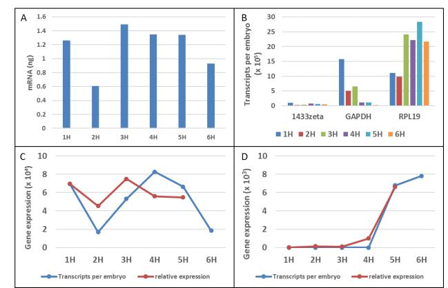 通過將每個胚胎的每個基因的所有轉(zhuǎn)錄物相加并計算以毫微克計的當量來計算每個胚胎的總mRNA(圖3A),總mRNA在1hpo時從1.2ng/胚胎下降至2hpo時為0.61ng/胚胎,然后在3hpo時增加至1.49ng/胚胎,然后在6hpo采樣結(jié)束時降至0.93ng/胚胎,反映了每個胚胎的總轉(zhuǎn)錄本(圖2D)。假設(shè)2-5%的總RNA是多腺苷酸化的,mRNA水平與我們在每個胚胎中獲得的總RNA產(chǎn)量一致。