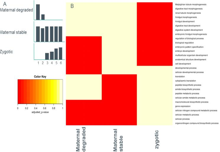 我們對3個類別基因集進行富集分析;母體降解基因,受精卵基因和母體穩(wěn)定/上調(diào)基因。母體降解基因也是1hpo中表達高的基因,富含細胞過程,發(fā)育和新陳代謝(圖6)。母體降解的基因也富含轉(zhuǎn)錄因子,例如DREF,BEAF-32A,PNR,它們是相應(yīng)的果蠅同源基因。類似母體降解基因,母體穩(wěn)定/上調(diào)基因在翻譯,生物合成過程,基因表達,代謝過程等方面得到豐富,反映了快速生長胚胎的高代謝活性,DREF轉(zhuǎn)錄因子也在這些基因中富集。受精卵基因富含特定的組織形成和發(fā)展過程,包括:后腸發(fā)育,模式規(guī)范,消化道形態(tài)發(fā)生等功能。