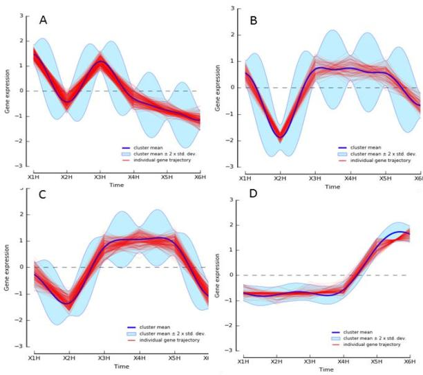 基因表達是一個嚴格調(diào)控的過程,在胚胎發(fā)育過程中,基因表達的時空動態(tài)調(diào)控對器官的正常發(fā)育至關(guān)重要。基于其時間表達動力學(xué)的基因聚類不僅將表達基質(zhì)的復(fù)雜性降低為簡單的基因集,而且還可以鑒定具有與先前所示相似的生物學(xué)功能的基因。實際上,我們鑒定了在不同時間點表達達到峰值的基因,證明了高度動態(tài)的轉(zhuǎn)錄本動力學(xué),并表明這些基因在確定的發(fā)育期間具有特定的作用(圖7)。我們進一步將這些集群分為3組;1)基因在3hpo達到峰值并且通常隨時間降低,稱為早期基因(圖7A),2)基因,其表達維持3-5hpo,稱為中間基因(圖7B和C),和3)基因其表達僅在5和/或6hpo時增加,稱為晚期基因(圖7D)。富集顯示,如先前在母體類別的基因中所觀察到的,早期基因和中間基因在細胞過程和代謝過程中富集,而晚期基因在專門的發(fā)育過程中富集。