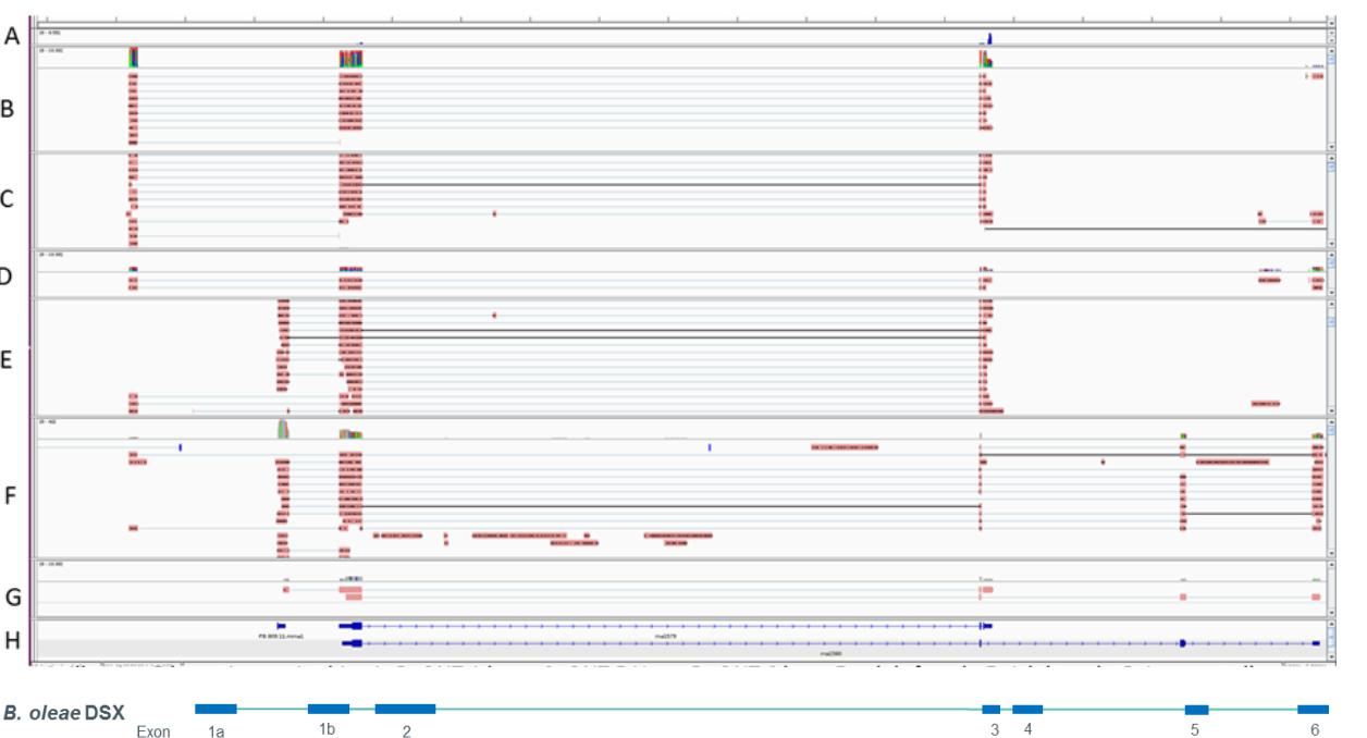 雙翅目昆蟲的性別決定機制在很大程度上是相同的,在果蠅(Drosophilamelanogaster)中,性別決定機制已被廣泛研究,性致死基因(sxl)作為主要調(diào)節(jié)因子,根據(jù)性染色體與常染色體的比例,調(diào)節(jié)本身和變異基因(tra)的性別特異性選擇性剪接。tra反過來調(diào)節(jié)性別特異性雙重性別的選擇性剪接(dsx),這是級聯(lián)的最后一個成員和性別差異發(fā)育的中介。B.oleae同源物已經(jīng)鑒定了sx1,tra和dsx。然而,主要的調(diào)控方式仍然難以捉摸。已經(jīng)提出橄欖蠅的性別決定在胚胎發(fā)育的前6小時內(nèi)發(fā)生,并且通過類似于黑腹果蠅中的性別決定機制的tra和dsx的可變剪接來調(diào)控。在轉(zhuǎn)錄組數(shù)據(jù)中,我們能夠觀察到tra和dsx的各種可變剪接。使用來自成年雄性和雌性頭部的數(shù)據(jù)來識別性別特異性亞型。在dsx的情況下,與成齡相比,早期發(fā)育階段的亞型復(fù)雜性顯著不同。在數(shù)據(jù)中,看到具有不同轉(zhuǎn)錄起始位點和長度較長的亞型,因為在發(fā)育的早期胚胎階段存在突出的亞型(圖8),成齡頭部組織中的這些亞型轉(zhuǎn)移到較短的亞型中,外顯子4存在于雌性中但不存在于雄性中。由于我們無法在早期胚胎階段檢測到這些性別特異性亞型,我們認為它們的表達在發(fā)育過程后期開始。然而,它們在后期階段的積累代表了在發(fā)育早期階段激活的性別調(diào)控系統(tǒng)。北京百邁客生物科技有限公司。