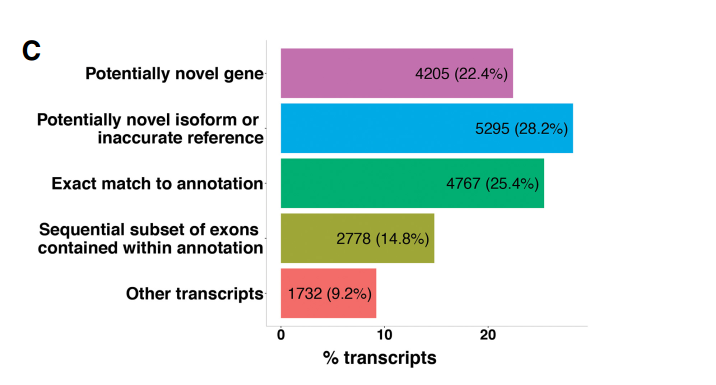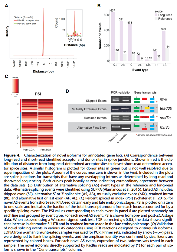 作者接著對(duì)全長(zhǎng)轉(zhuǎn)錄組對(duì)已注釋基因鑒定到的未記錄的轉(zhuǎn)錄本的可變剪切形式的研究。 由于斑馬魚參考基因組對(duì)可變剪切的注釋較少,文章使用短讀長(zhǎng)的轉(zhuǎn)錄組數(shù)據(jù)對(duì)可變剪切位 點(diǎn)進(jìn)行驗(yàn)證。作者使用 STAR 軟件分析轉(zhuǎn)錄組數(shù)據(jù),預(yù)測(cè)了 3000 個(gè)可變剪切位點(diǎn),其中 99% 可以與全長(zhǎng)轉(zhuǎn)錄本數(shù)據(jù)吻合。剪接位點(diǎn)的這種近乎完美的一致性支持證明了全長(zhǎng)轉(zhuǎn)錄組鑒定 的外顯子 – 內(nèi)含子邊界的準(zhǔn)確性,并強(qiáng)烈支持新檢測(cè)到的可變剪接形式的有效性。通過全 長(zhǎng)轉(zhuǎn)錄組共發(fā)現(xiàn)了 2000 種新型可變剪切類型,其中已注釋基因的新型可變剪切共 1835 中, 平均每個(gè)基因的可變剪切類型提升 50%。