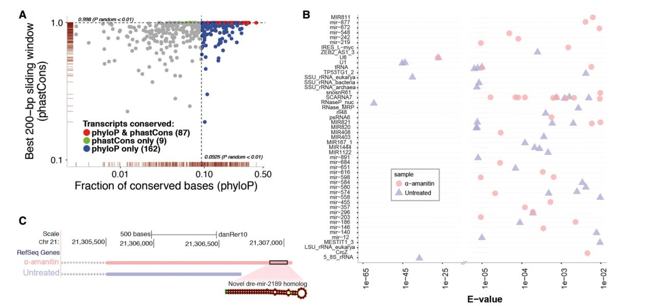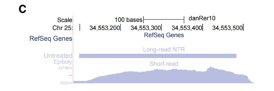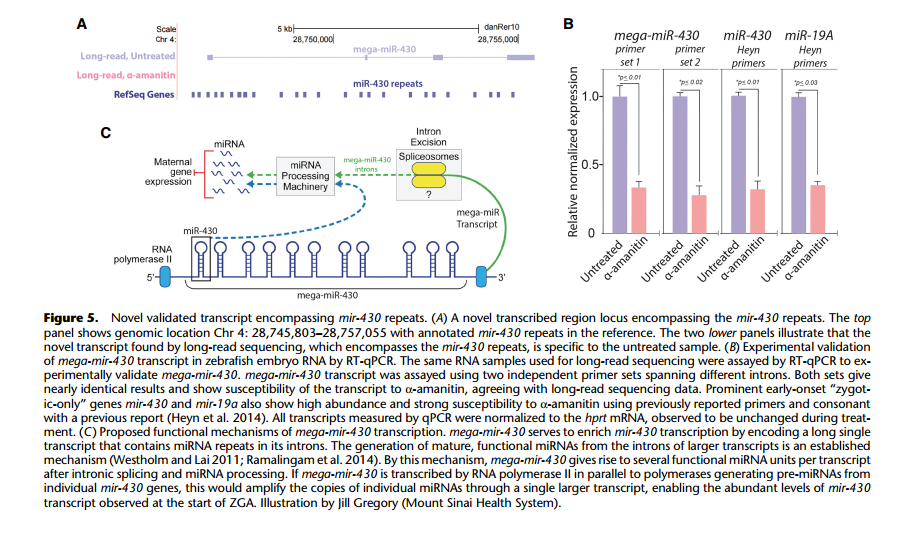 通過全長(zhǎng)轉(zhuǎn)錄組鑒定到的大量新轉(zhuǎn)錄本中包括了一種重要 miRNA- miR-430,mir-430 可能是第一個(gè)表達(dá)的合子基因,它通過對(duì)所有母源轉(zhuǎn)錄基因進(jìn)行的特異性沉默和降解將合子 基因的啟動(dòng)和母體程序的消除連接起來。在以前的研究中,對(duì)其功能研究較多,而對(duì)于 miR-430 的來源研究較少。作者鑒定到了一個(gè)新的跨越 9kb 基因組序列的四外顯子轉(zhuǎn)錄本, 該轉(zhuǎn)錄本重疊 22 個(gè) mir-430 重復(fù)序列,被稱為“mega-mir-430”。 在α-amanitin 處理中沒 有檢測(cè)到 mega-mir-430,并通過 qPCR 進(jìn)行了驗(yàn)證,推斷它來源于合子基因組。從每個(gè) mega-mir-430 轉(zhuǎn)錄本產(chǎn)生多個(gè) mir-430 的拷貝,這個(gè)發(fā)現(xiàn)解釋了合子基因激活時(shí) mir-430 高表達(dá)的原因。
