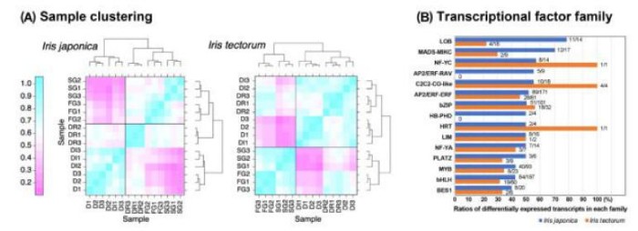 蝴蝶花(IJ):利用Illumina平臺(tái)對FG、DI、D、DR、SG階段的樣本進(jìn)行測序,并進(jìn)行從頭組裝,為蝴蝶花生成參考轉(zhuǎn)錄組。