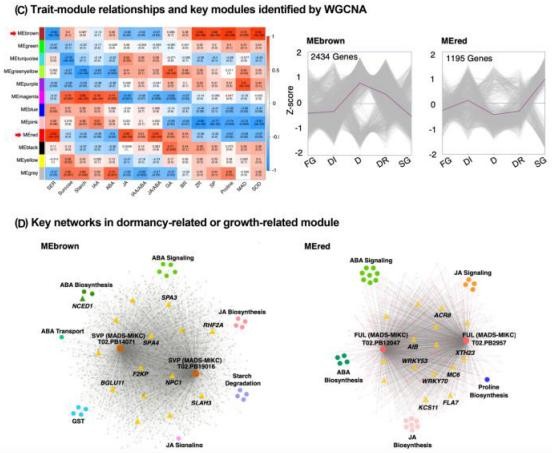 為了了解基因和通路的動(dòng)態(tài)變化,并識(shí)別鳶尾越冬性休眠過程中的休眠相關(guān)模塊,我們對IJ的所有15118個(gè)差異轉(zhuǎn)錄本進(jìn)行了WGCNA分析,共鑒定出12個(gè)共表達(dá)模塊.對每個(gè)模塊進(jìn)行了主要的表達(dá)趨勢和KEGG富集分析。并進(jìn)行模塊-形狀關(guān)聯(lián)分析,選擇形狀特異性模塊和階段特異性模塊。結(jié)果中找到分別與冬季生長率呈顯著正、負(fù)相關(guān)的生長模塊(red)和休眠模塊(brown),MADS-box家族基因FUL/AP1和SVP分別位于兩個(gè)模塊,并與植物激素合成與信號(hào)轉(zhuǎn)導(dǎo)、碳水化合物代謝和環(huán)境響應(yīng)通路基因共表達(dá)。
