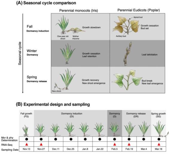 冬季休眠是植物應(yīng)對潛在致命環(huán)境的最關(guān)鍵策略。近幾十年來,由于氣候的變化,在經(jīng)濟(jì)上具有重要意義的多年生雙子葉植物中的這一過程得到了廣泛的研究。然而,在不需要冷卻的常綠單子葉植物中,休眠過程至今仍是一個(gè)謎。因此,揭示這些單子葉植物越冬休眠的調(diào)控機(jī)制,不僅有助于更好地開發(fā)利用植物資源,而且對應(yīng)對全球變暖帶來的低溫不足的挑戰(zhàn)具有重要意義。通過多年物候觀測發(fā)現(xiàn),鳶尾和蝴蝶花越冬休眠過程均僅有生態(tài)休眠,將休眠植株移至適宜條件下能迅速恢復(fù)生長,且在同一栽培地區(qū)二者越冬休眠期存在明顯差異,是研究多年生單子葉植物越冬休眠機(jī)理的理想材料。本研究比較了鳶尾(I.tectorum)和蝴蝶花(I.japonica)在關(guān)鍵發(fā)育時(shí)間點(diǎn)的休眠過程。這兩種鳶尾都表現(xiàn)出短暫的休眠過程,且持續(xù)時(shí)間不同,在溫暖條件下都能很容易地恢復(fù)生長。為了破譯轉(zhuǎn)錄變化,作者對鳶尾進(jìn)行了全長測序,對蝴蝶花進(jìn)行了RNA-seq測序,分別生成參考轉(zhuǎn)錄組,揭示了調(diào)控常綠與落葉類鳶尾越冬休眠的分子機(jī)制。