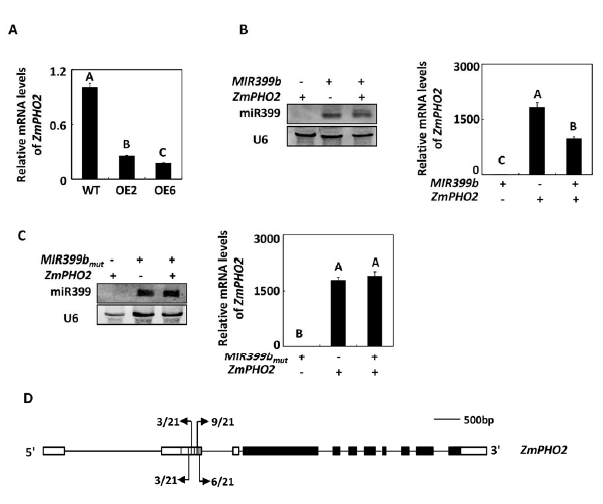 我們接下來用兩個miR399結(jié)構(gòu)(ZmMIR399b和ZmMIR399bmut將6個突變引入到ZmMIR399b的成熟序列中)在煙草中做瞬時轉(zhuǎn)化。如圖2B,當(dāng)與ZmMIR399b共表達(dá)時,ZmPHO2轉(zhuǎn)錄本顯著增加,但是與ZmMIR399bmut共表達(dá)時卻不受影響(見圖2C)。另外,我們使用缺pi脅迫六天的玉米苗子的RNA,通過5,RACE檢測到6個ZmPHO2的預(yù)測靶標(biāo)中的4個,見圖2D。這些結(jié)果顯示,在玉米中ZmPHO2是ZmmiR399的靶標(biāo),miR399-PHO2調(diào)控模塊在玉米中是保守的,和在擬南芥和水稻中一樣。