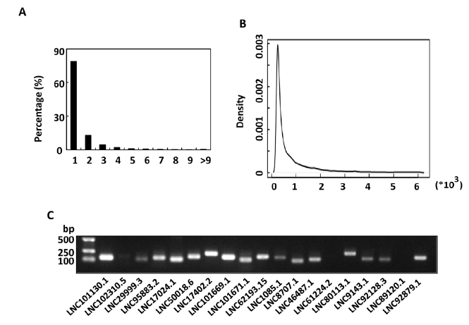 圖4:玉米lncRNAs的鑒定。A,每個lncRNA轉(zhuǎn)錄本的外顯子分布;B,lncRNA的外顯子長度密度分布;C,RT-PCR證實(shí)隨機(jī)選擇的lncRNA