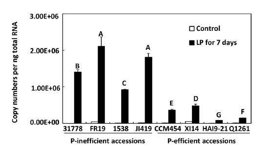 為了進(jìn)一步驗(yàn)證在低磷脅迫的玉米中miRNA/PHO2之間的關(guān)系,用磷低效株Qi205和磷高效株CCM454進(jìn)行雜交,構(gòu)建分離群體。從F2:3家系中隨機(jī)選擇出來100個株系去確定水培條件下的低磷脅迫情況。選擇出10個最耐和10個最感的株系,再從剩余的80個株系中選出來10個株系作為對照。在低磷脅迫下,這些株系的ZmmiR399是上調(diào)的。在磷高效株系中,觀察到通過ZmmiR399誘導(dǎo)的ZmPHO2是下調(diào)的。這些結(jié)果表明,在玉米中miR399誘導(dǎo)的ZmOHO2后轉(zhuǎn)錄抑制增加了對磷缺乏的耐性。