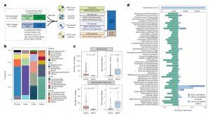 進(jìn)一步深入探索了可用的高質(zhì)量基因組中編碼的代謝潛力。分析了 UHGG 和 IMGG 數(shù)據(jù)集中的高連續(xù)性和高質(zhì)量基因組。共從15512個(gè)基因組中還原了97428個(gè)MGC區(qū)域,其中78675個(gè)是完整的,并被納入進(jìn)一步分析。這些完整的MGC屬于所有八個(gè)MGC類別,分布在58個(gè)MGC類型中。*常見的類別是SCFA(40.0%),其次是Putative(28.9%)和E-MGC(17.2%)。然后,門水平分布和聚類分析揭示了MGC類別的總體分布在門水平的顯著差異(圖4a),以及在十個(gè)主要的門之間,它們?cè)诓煌T中的數(shù)量各不同(圖4a)。此外,基于涵蓋九個(gè)主要門的功能性MGC分類分布的特異性聚類表明,MGC概述和組成在門水平間存在顯著差異,這些未培養(yǎng)物種中的一些最近發(fā)現(xiàn)了以前未報(bào)告的Christensenellales和Oscillospirales分類群,突出了這些代表性不足的分類群在促進(jìn)宿主健康方面的潛力(圖4c)。