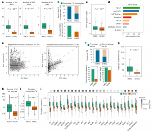 與UHGG數(shù)據(jù)庫相比,IMGG數(shù)據(jù)庫中前噬菌體基因組的分辨率有了很大提升。該方法在95%的IMGG中都能檢測(cè)到前噬菌體序列(與UHGG(55%)相比)。IMGG和UHGG每個(gè)基因組編碼前噬菌體的平均數(shù)量分別為4個(gè)和1個(gè)。IMGG中的前噬菌體序列的連續(xù)性也較高,N50長(zhǎng)度為37974 bp(UHGG中為31064 bp;圖3f);IMGG中前噬菌體編碼區(qū)的基因組比例是UHGG的4.2倍(圖3g)。與UHGG相比,IMGG中的IS區(qū)域更加jing q,表現(xiàn)在在每個(gè)物種的IS區(qū)域總拷貝數(shù)(增加了三倍;圖3h)和IS編碼區(qū)域的基因組比例(增加了近四倍;圖3i)。IS類別中改善程度*高的是IS1380(與UHGG相比,改善了5.6倍),其次是IS5、IS1634和ISAS1(分別是5.5倍、5.5倍和5.3倍;圖3j)。