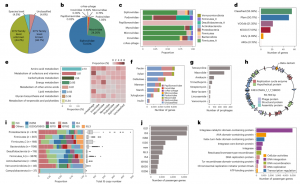 接下來,對(duì)IMGG數(shù)據(jù)庫中的前噬菌體基因組進(jìn)行深入分析,以探究其功能能力。從12834個(gè)物種水平的vOTU代表性基因組中鑒定出596193個(gè)蛋白質(zhì)編碼基因,并將這些假定基因與幾個(gè)常見的功能和/或病毒注釋數(shù)據(jù)庫進(jìn)行了比較。結(jié)果表明,僅有55.4%的前噬菌體基因在功能上能夠被分類,而44.6%的基因與任何交叉比較的數(shù)據(jù)庫都不具有同源性,被分配給了未知的功能(圖5d)。這些結(jié)果表明,盡管攜帶ARG的噬菌體很少存在于腸道微生物中,但這些噬菌體可能編碼ARG(例如,A163.CMAG_1_1_7_59800編碼假定的β-內(nèi)酰胺酶基因;圖5h),可能成為ARG轉(zhuǎn)移的關(guān)鍵載體,并對(duì)人類健康造成嚴(yán)重威脅。這些結(jié)果表明,腸道前噬菌體在分類和功能上比先前我們所了解的更加多樣化。