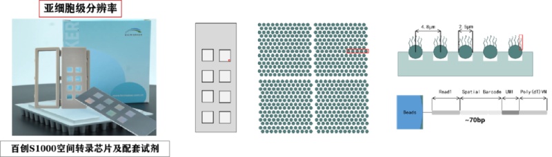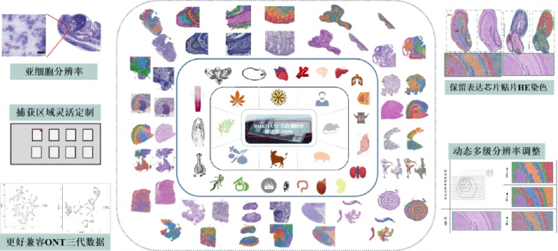 百創(chuàng)智造自主研發(fā)的基于微孔微珠的亞細(xì)胞級(jí)分辨率空間轉(zhuǎn)錄芯片BMKMANU S1000,包含1~8個(gè)捕獲區(qū)域,可在亞細(xì)胞分辨率水平上,檢測(cè)完整組織切片中的原位基因表達(dá)信息,實(shí)現(xiàn)組織結(jié)構(gòu)的精細(xì)解讀。同時(shí)支持100μm~4,8μm多級(jí)分辨率的調(diào)整,并且支持HE染色,能更好觀察組織病理形態(tài),目前已在上百例組織樣本中得到性能驗(yàn)證。