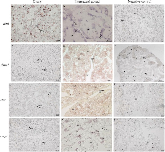 用原位雜交(ISH)技術分析了不同性腺階段性相關基因(dazl、Dmrt1、star、rergl)的定位。dazlmRNA僅限于斜帶石斑魚的雌性和雄性生殖細胞(卵母細胞、SG和SC)表達(圖9a、b),結果表明dazl是一種生殖細胞標記物,在睪丸中高表達,這與其他物種中dazl的表達一致。在自然雌性的卵巢中未檢測到Dmrt1信號(圖9d)。性逆轉后期的性腺有豐富的雄性生殖細胞SG、SC和ST,帶有dmrt1陽性信號,而卵母細胞沒有dmrt1信號(圖9e),因此dmrt1可以被認為是斜帶石斑魚的生殖細胞標記。star作為合成類固醇激素途徑中的限速酶,其在雄性斜帶石斑魚的睪丸中特異表達,而在卵母細胞中未檢測到star信號(圖9g)。此外,發(fā)現(xiàn)starmRNA在SG、SC和ST中表達(圖9h)。rerglmRNA僅在雄性生殖細胞中檢測到(圖9j,k),這與RT-qPCR結果一致,暗示其在性別調節(jié)中的潛在作用。dazl、dmrt1、star和rergl的雜交探針作為對照實驗顯示性腺中沒有信號(圖9c、f、I、l)。