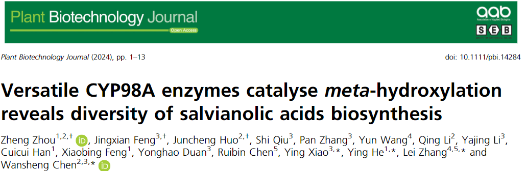 2024年1月16日,海軍軍醫(yī)大學(xué)陳萬生與張磊團隊合作在植物學(xué)領(lǐng)域國際一流學(xué)術(shù)期刊《植物生物技術(shù)》Plant Biotechnology Journal發(fā)表一項最新研究成果,題為:Versatile CYP98A enzymes catalyse meta-hydroxylation reveals diversity of salvianolic acids biosynthesis。本研究以富含丹酚酸的代表性重要藥用植物丹參為研究對象,闡明了丹酚酸生物合成的多樣性,為CYP98A酶在間位羥基化反應(yīng)中催化特異性的通用性提供了新的見解,同時也證明CYP98A酶是利用代謝工程策略提高丹酚酸含量的理想操作靶點。中藥丹參為唇形科鼠尾草屬植物丹參(Salvia miltiorrhiza Bge.)的干燥根和根莖,是我國常用中藥。丹參藥用歷史悠久,始載于中國傳統(tǒng)醫(yī)藥學(xué)典籍《神農(nóng)本草經(jīng)》,具有祛疲止痛、活血通經(jīng)、清心除煩之功效。丹參作為復(fù)方丹參滴丸、復(fù)方丹參片、丹紅注射液等藥物的原料,廣泛應(yīng)用于心、腦血管疾病的治療,丹參藥材的年使用量超萬噸,屬于大宗常用中藥材。丹參有效成分主要包括脂溶性的丹參酮類化合物和水溶性的丹酚酸類化合物。