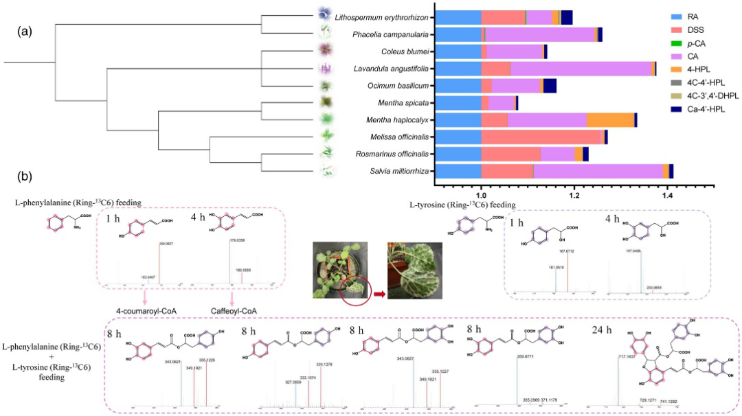 丹參中酪氨酸衍生的途徑從未被報道過,丹參素(DSS)是否參與SA生物合成仍然未知。SA的生物合成可能是多樣化的,作者在同位素標(biāo)記的喂養(yǎng)實驗去驗證這一結(jié)論。含有同位素標(biāo)記的 L-苯丙氨酸和 L-酪氨酸浸潤3個月大的丹參葉子中。從不同時間點收集的葉片中提取SA,并使用UPLC-Q-TOF/MS進行分析。結(jié)果顯示,在p-CA、CA、4-HPL、DSS、SAB和RA及其前體(包括4C-4′-HPL、4C-3′、4′-DHPL和Ca-4′-HPL)均被檢測出標(biāo)記(圖1b)。這些結(jié)果驗證了作者的推測,即不同的?;w,包括4C-CoA和CA-CoA以及含有4-HPL和DSS的?;荏w參與SA的形成。SA的生物合成途徑是多種多樣的。
