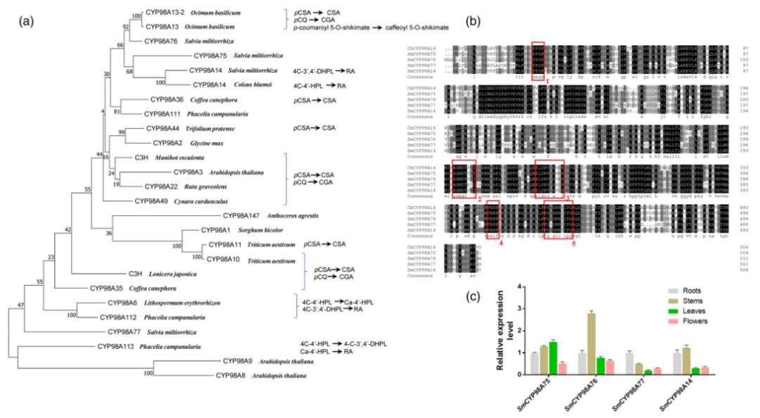 從SmCYP98A亞家族中鑒定出4種酶,分別是SmCYP98A75、SmCYP98A76、SmCYP98A77和SmCYP98A14。SmCYP98A家族酶能催化羥基肉桂酸酯的間羥基化形成RA,說明它們屬于4-香豆酰酯3-羥化酶(C3H)家族。通過鄰連接樹(NJ樹)分析,SmCYP98A酶與C3H之間的系統(tǒng)發(fā)育關(guān)系(圖2a)。結(jié)果表明,SmCYP98A75與SmCYP98A14和CbCYP98A14具有更顯著的序列同源性。而SmCYP98A77與其他CYP98A成員同源性較低。四種SmCYP98A 酶的氨基酸序列包含 P450 單加氧酶的幾個特征基序,例如 PERF 基序、血紅素結(jié)合半胱氨酸基序和含蘇氨酸的結(jié)合口袋(圖2b)。