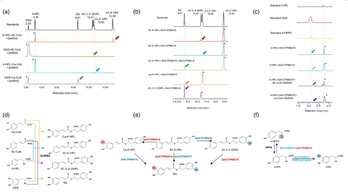 上述研究表明SmCYP98A75負(fù)責(zé)RA生物合成中?;荏w部分的 C-3′羥基化,因此作者推測SmCYP98A 酶可能在丹參素DSS形成中發(fā)揮重要作用。體外酶活實驗表明,當(dāng)SmCYP98A75或SmCYP98A14與4-HPL一起孵育時,在產(chǎn)物中檢測到4-HPPA,說明這兩種酶表現(xiàn)出將4-HPL的側(cè)鏈羥基直接氧化為酮的能力。然而,在兩個反應(yīng)系統(tǒng)中均未檢測到DSS。作者認(rèn)為植物內(nèi)部生物合成環(huán)境是復(fù)雜的,包括許多代謝途徑和催化酶,在反應(yīng)體系中加入?;w和SmRAS,以模擬丹參的DSS生物合成。與SmRAS和4C-CoA或Ca-CoA孵育后,僅在SmCYP98A75催化的反應(yīng)中產(chǎn)生DSS(圖3c,f)。