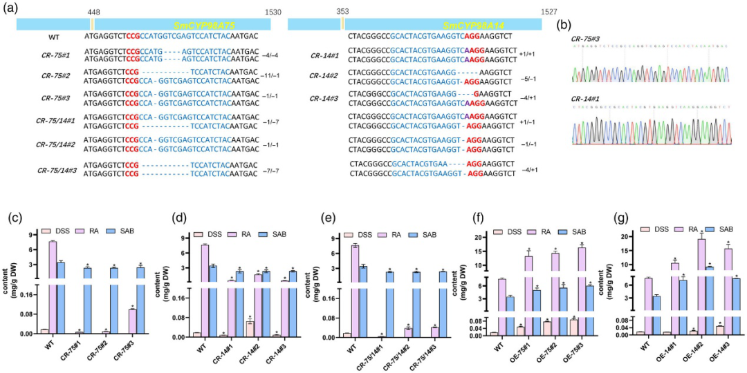 為了進一步研究SmCYP98A75和SmCYP98A14在SA生物合成中的作用,作者利用CRISPR/Cas9技術(shù)生成了SmCYP98A75和SmCYP98A14單突變體和雙突變體。純合突變體用于分析SA積累(圖4a,b)。與WT相比,突變體顯示出更低的SA積累。SmCYP98A75 和SmCYP98A14 突變體的DSS、RA和SAB水平降低,尤其是SmCYP98A75突變體中幾乎檢測不到DSS。與WT相比,雙突變體中DSS和RA幾乎檢測不到,表明CYP98A成員在SA生物合成中都起著重要作用(圖4c-e)。進一步檢測SA生物合成途徑中關(guān)鍵酶的表達水平,包括SmPAL、SmC4H、Sm4CL、SmTAT、SmHPPR和SmRAS在突變體毛根中的表達。結(jié)果表明,與WT相比,SmCYP98A75 和SmCYP98A14單突變系和雙突變系中SmPAL、SmC4H、SmTAT和SmRAS 的轉(zhuǎn)錄水平顯著降低。