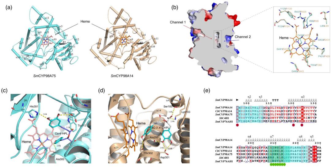 SmCYP98A75和SmCYP9814底物特異性的差異為研究底物識別和代謝的結(jié)構(gòu)特征提供了機會。使用在線SWISS-MODEL進行同源建模。SmCYP98A75和SmCYP98A14的整體結(jié)構(gòu)模型高度相似,表明兩種SmCYP98A的底物識別和代謝是保守的。SmCYP98A75的整體結(jié)構(gòu)模型包含22個α螺旋和8個β鏈,SmCYP98A14的整體結(jié)構(gòu)模型包含20個α螺旋和6個β鏈,與 SmCYP98A14 高度相似(圖5a)。在結(jié)構(gòu)模型中觀察到血紅素分子與兩個 SmCYP98A 的活性結(jié)合口袋。通過與口袋內(nèi)殘基的多次相互作用,它被穩(wěn)定在正確的位置。兩種SmCYP98A和CbCYP98A14的血紅素包圍基序和關(guān)鍵催化氨基酸是高度保守的(圖5b)?;谂c已知 P450 的疊加,通道 1 可能容納底物進入和產(chǎn)物,而通道 2 可能使血紅素能夠進入水和質(zhì)子。
