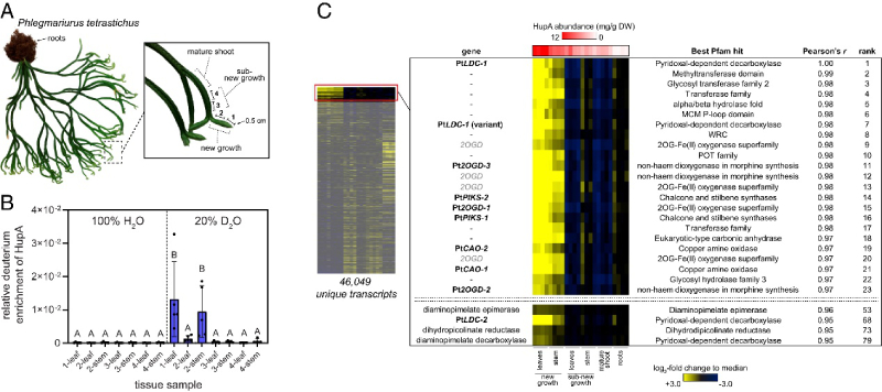 為了指導(dǎo)對(duì)石松生物堿生物合成的研究,作者重點(diǎn)關(guān)注 HupA,因?yàn)樗阎哂凶鳛?AChE 抑制劑的活性和作為藥物的潛力。HupA 由石松屬內(nèi)的物種產(chǎn)生,但這些物種的 HupA 積累水平差異很大。作者推斷物種中 HupA 的增加可能與上調(diào)的生物合成基因表達(dá)有關(guān)。因此,檢測(cè)了石松屬的幾個(gè)物種的 HupA 含量,結(jié)果發(fā)現(xiàn)P. tetrastichus(圖 2A)積累了 HupA 到最高水平。因此,后續(xù)的研究將集中在該物種上。之前的研究表明,從頭 HupA 生物合成對(duì)P. tetrastichus枝條的新生長(zhǎng)具有特異性,接著作者通過(guò)氘同位素標(biāo)記實(shí)驗(yàn)得到驗(yàn)證,并且發(fā)現(xiàn)與莖相比,HupA標(biāo)記在葉中更廣泛分布,表明這里的生物合成基因表達(dá)富集(圖2B)。因此,作者對(duì)對(duì)該物種的多個(gè)組織進(jìn)行了RNA-seq分析,揭示石杉生物堿生物合成基因在活性組織中的積累機(jī)制。