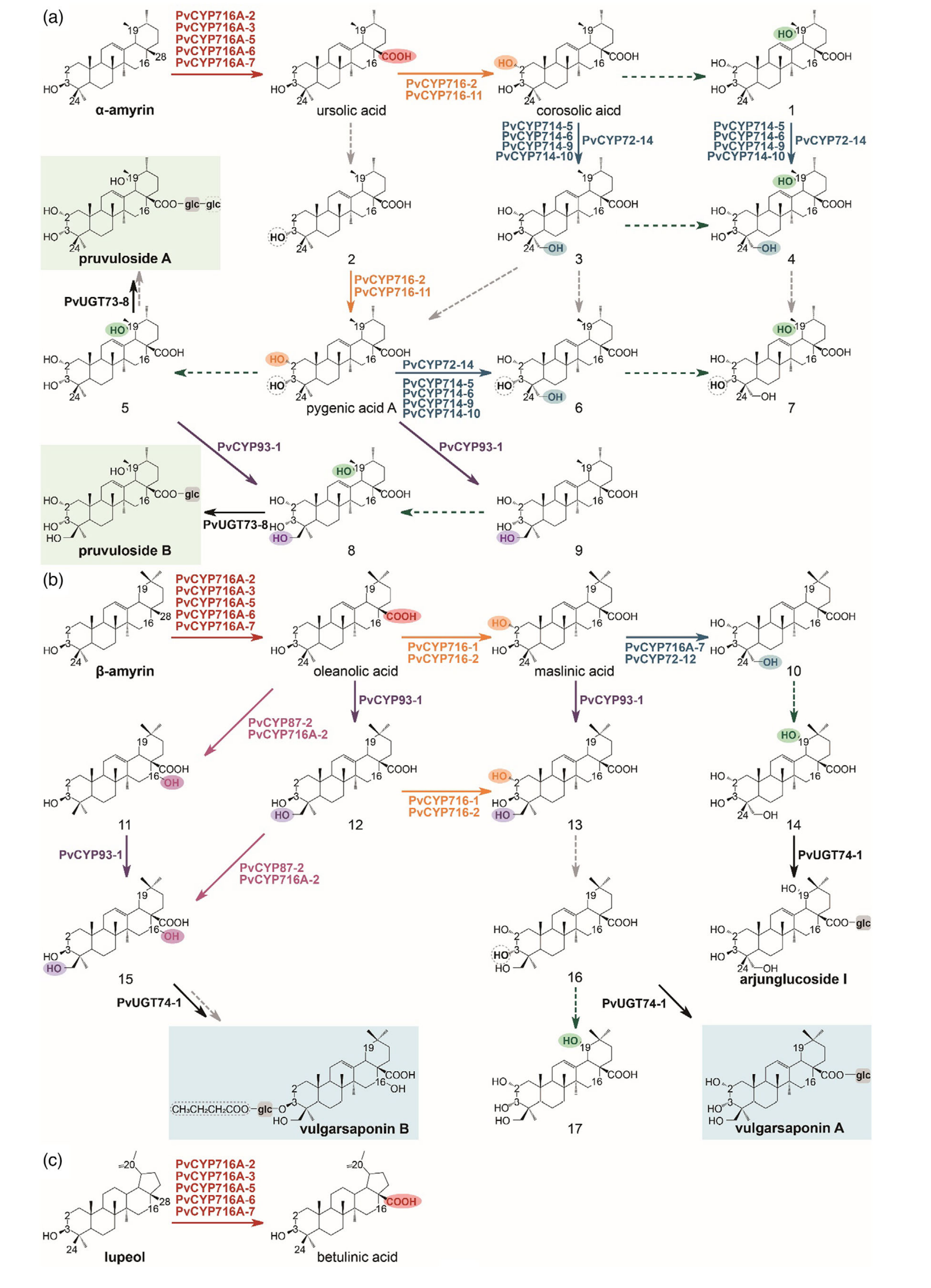 CYP超家族是植物中最大的基因超家族之一。根據(jù)CYP系統(tǒng)發(fā)育樹的分支,植物CYP蛋白可分為11個(gè)氏族和127個(gè)家族。有七個(gè)氏族是單家族,包括CYP51、CYP74、CYP97、CYP710、CYP711、CYP727、CYP746,而其余的CYP71、CYP72、CYP85、CYP86氏族為多家族。在生成骨架后,在五環(huán)三萜的C-2、C-3、C-16、C-19、C-22、C-23、C-24、C-28等不同位點(diǎn)進(jìn)行氧化和糖基化修飾,生成大量的三萜。氧化修飾主要涉及CYP716家族成員。此外,CYP51、CYP71、CYP72、CYP85、CYP87、CYP88和CYP93家族的一些成員也可能參與。