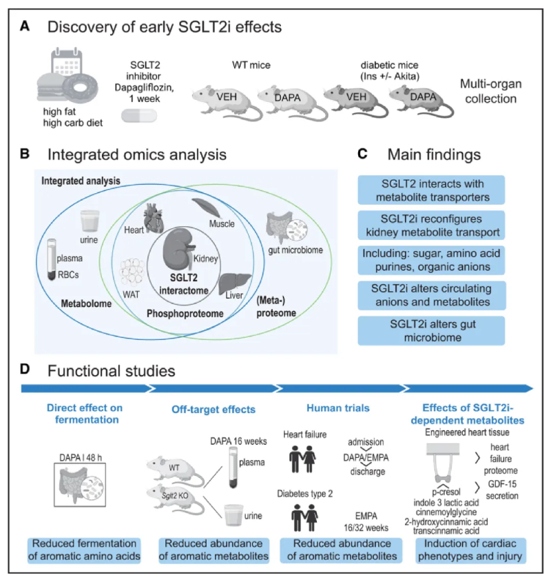 丹麥奧胡斯大學學者在Circulation雜志上發(fā)表題為“Metabolic Communication by SGLT2 Inhibition“研究論文,研究團隊使用Akita小鼠模型和臨床隊列樣品,通過整合宏基因組、代謝組、蛋白組等多組學數(shù)據(jù),確定了SGLT2i對腎臟、心臟、血管和其他器官的幾種SGLT2依賴性效應(yīng)和脫靶效應(yīng),通過重構(gòu)腎臟代謝物轉(zhuǎn)運和全身代謝通訊,發(fā)揮心腎保護作用。提供了關(guān)于SGLT2相互作用因子和SGLT2i依賴性蛋白質(zhì)組、代謝組、磷酸化蛋白質(zhì)組和宏蛋白質(zhì)組的新見解,從而為SGLT2i新型和早期機制靶標提供了潛在的路線,促進代謝藥物的開發(fā)。