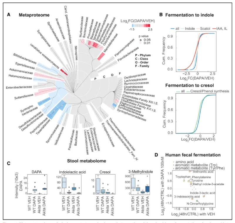 由于WT小鼠中SGLT2i改變的許多血漿溶質(zhì)是芳香族氨基酸的代謝物,因此分析了可以在蛋白質(zhì)組水平上代謝這些氨基酸的細菌的豐度。對于產(chǎn)生吲哚的細菌,發(fā)現(xiàn)表達色氨酸酶以從色氨酸產(chǎn)生吲哚的物種減少(吲哚丙烯酸;圖4B)。